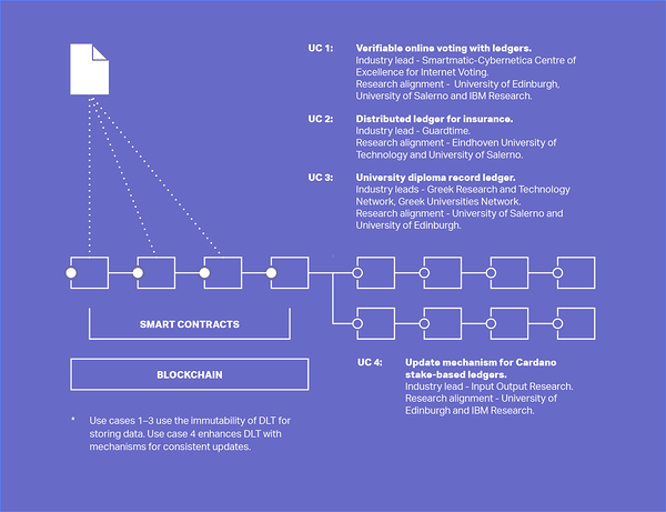 The four use cases require the successful use of privacy-preserving techniques developed in PRIViLEDGE. Plus, the fourth use case addresses cryptographic protocols for software updates on distributed ledgers. These cryptographic guarantees enhance the standard assurance properties of the ledger in terms of availability, consistency, and immutability of the recorded data.